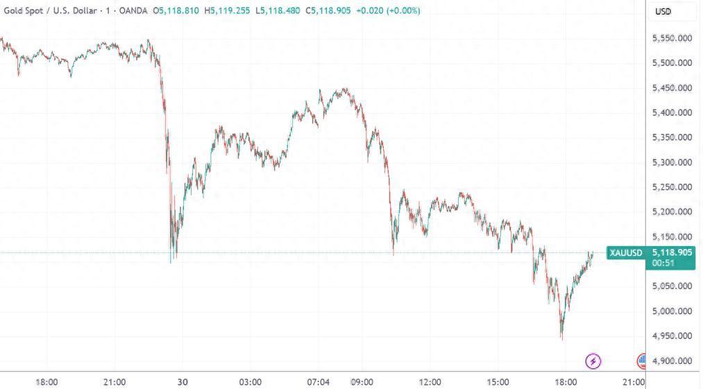 。虽然随后又回升至5400美元上方,但剧烈的波动已经显著加剧市场的紧张情绪。白银也从每盎司120美元跳水至108美元,随后又回升至118美元。